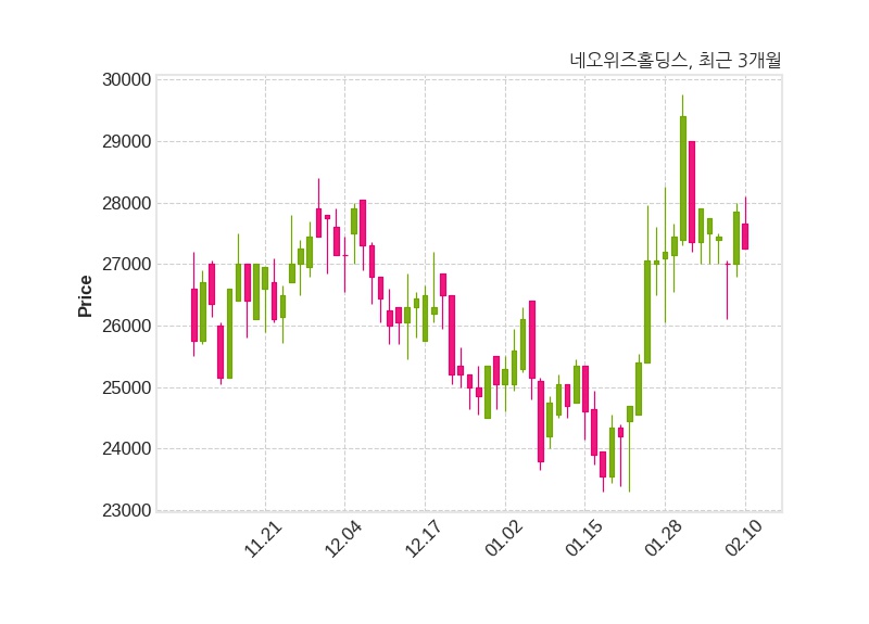 한편, 네오위즈홀딩스는 장 마감 이후 해당 기업공시를 발표했으며 오늘 종가가 27,250원, 거래량은 6,562주로, 직전 거래일 대비 600원(-2.15%) 하락했다.