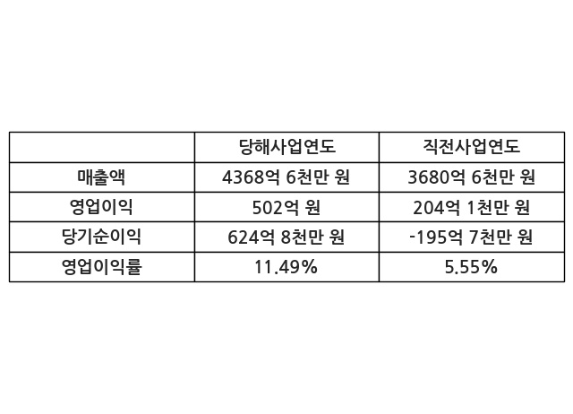 이번사업연도의 매출액은 직전사업연도 대비 18.69% 증가한 4368억 6천만 원, 영업이익은 502억 원, 당기순이익은 624억 8천만 원이라고 공시했다.