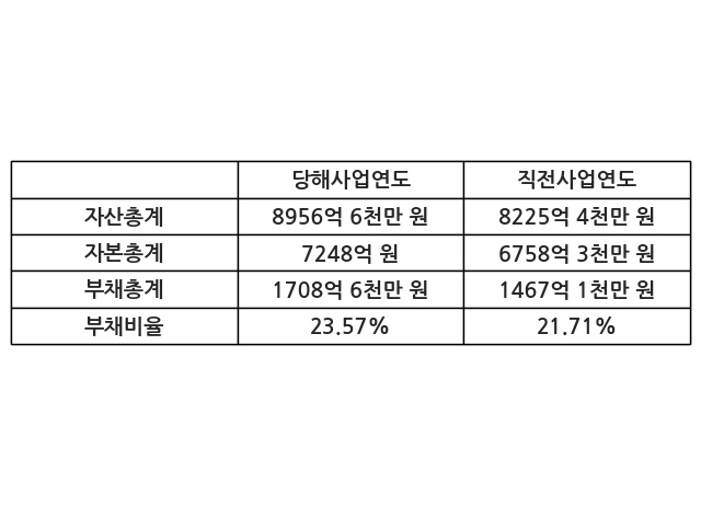 또한, 이번사업연도의 자산총계는 8956억 6천만 원으로 직전사업연도 대비 8.89% 증가한 한편, 부채총계는 1708억 6천만 원으로 16.46% 증가, 자본총계는 7248억 원으로 7.25% 증가했다.