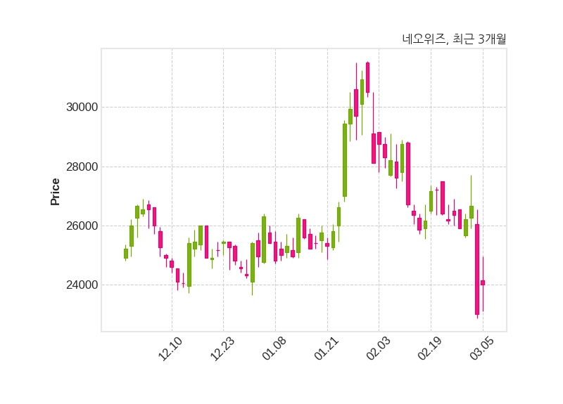 한편, 네오위즈는 장 마감 이후 해당 기업공시를 발표했으며 오늘 종가가 24,000원, 거래량은 177,076주로, 직전 거래일 대비 1,000원(+4.35%) 상승했다.