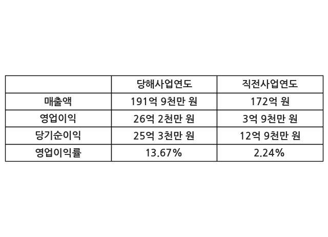 이번사업연도의 매출액은 직전사업연도 대비 11.56% 증가한 191억 9천만 원, 영업이익은 26억 2천만 원, 당기순이익은 25억 3천만 원이라고 공시했다.