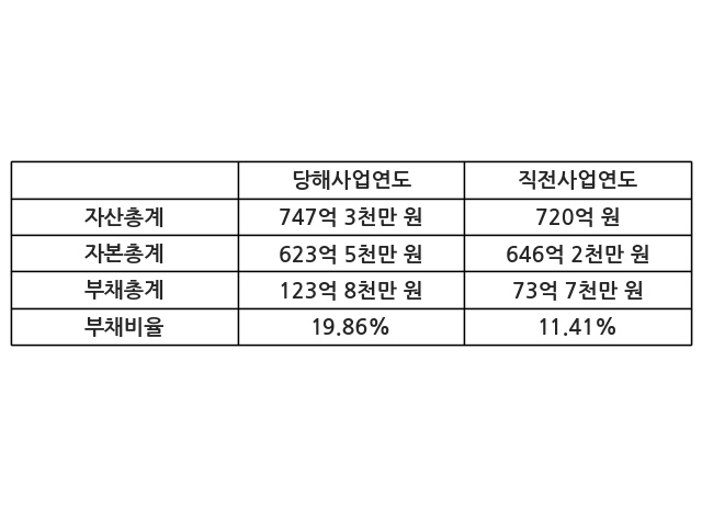 또한, 이번사업연도의 자산총계는 747억 3천만 원으로 직전사업연도 대비 3.8% 증가한 한편, 부채총계는 123억 8천만 원으로 67.94% 증가, 자본총계는 623억 5천만 원으로 -3.52% 감소했다.
