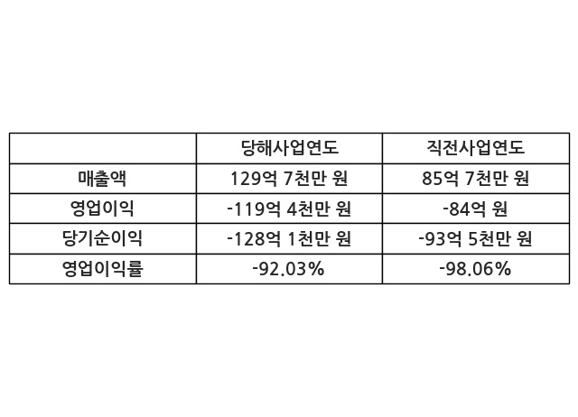 이번사업연도의 매출액은 직전사업연도 대비 51.37% 증가한 129억 7천만 원, 영업이익은 -119억 4천만 원, 당기순이익은 -128억 1천만 원이라고 공시했다.