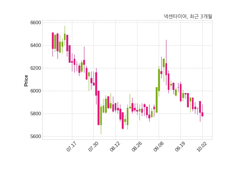 한편, 넥센타이어의 11시 54분 현재주가는 5,780원으로 직전 거래일 대비 30원(-0.52%) 하락이며, 거래량은 41,720주이다.