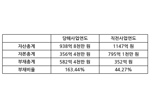 또한, 이번사업연도의 자산총계는 938억 8천만 원으로 직전사업연도 대비 -18.16% 감소한 한편, 부채총계는 582억 4천만 원으로 65.47% 증가, 자본총계는 356억 4천만 원으로 -55.18% 감소했다.