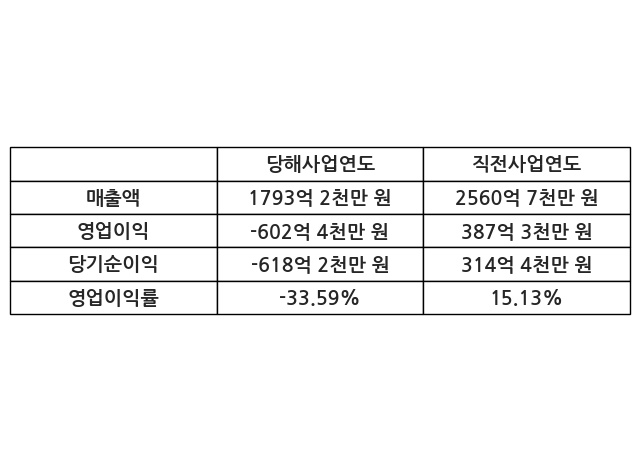 이번사업연도의 매출액은 직전사업연도 대비 -29.97% 감소한 1793억 2천만 원, 영업이익은 -602억 4천만 원, 당기순이익은 -618억 2천만 원이라고 공시했다.