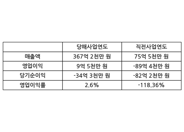 이번사업연도의 매출액은 직전사업연도 대비 386.32% 증가한 367억 2천만 원, 영업이익은 9억 5천만 원, 당기순이익은 -34억 3천만 원이라고 공시했다.