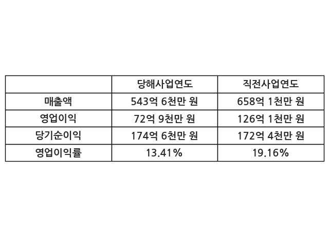 이번사업연도의 매출액은 직전사업연도 대비 -17.4% 감소한 543억 6천만 원, 영업이익은 72억 9천만 원, 당기순이익은 174억 6천만 원이라고 공시했다.