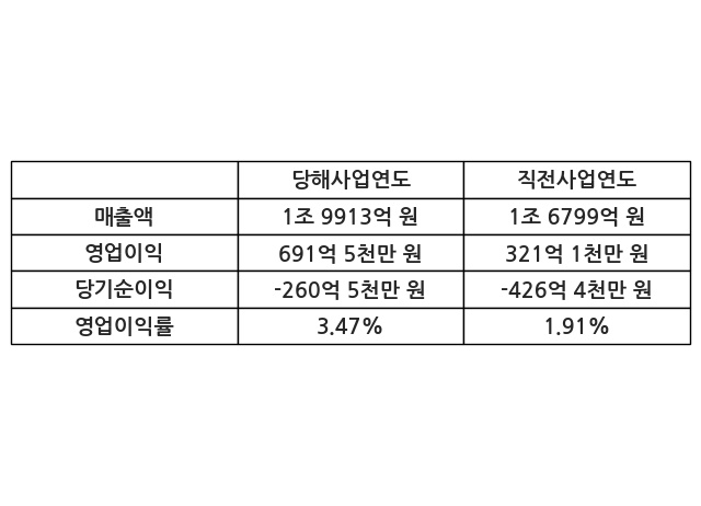 이번사업연도의 매출액은 직전사업연도 대비 18.54% 증가한 1조 9913억 원, 영업이익은 691억 5천만 원, 당기순이익은 -260억 5천만 원이라고 공시했다.