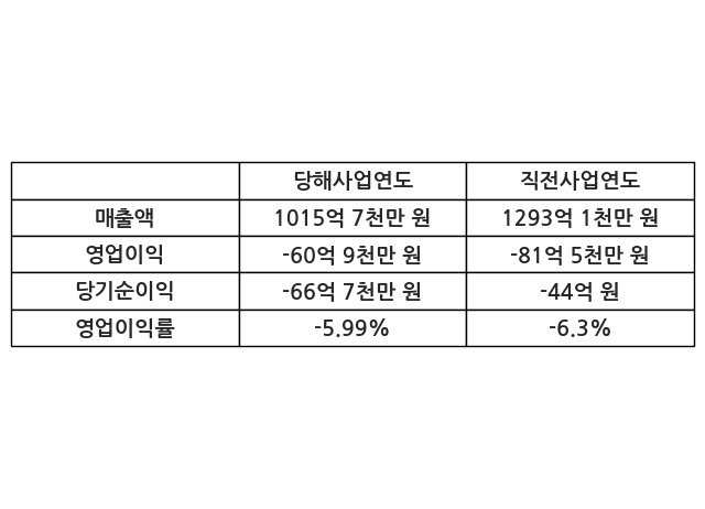 이번사업연도의 매출액은 직전사업연도 대비 -21.45% 감소한 1015억 7천만 원, 영업이익은 -60억 9천만 원, 당기순이익은 -66억 7천만 원이라고 공시했다.