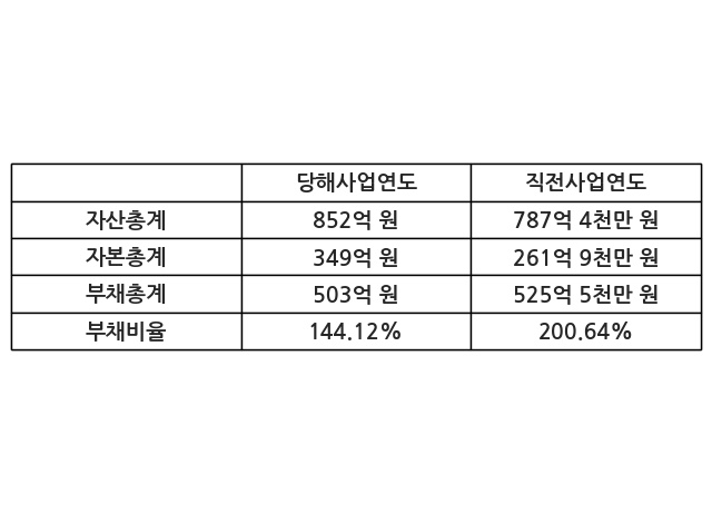 또한, 이번사업연도의 자산총계는 852억 원으로 직전사업연도 대비 8.2% 증가한 한편, 부채총계는 503억 원으로 -4.28% 감소, 자본총계는 349억 원으로 33.25% 증가했다.