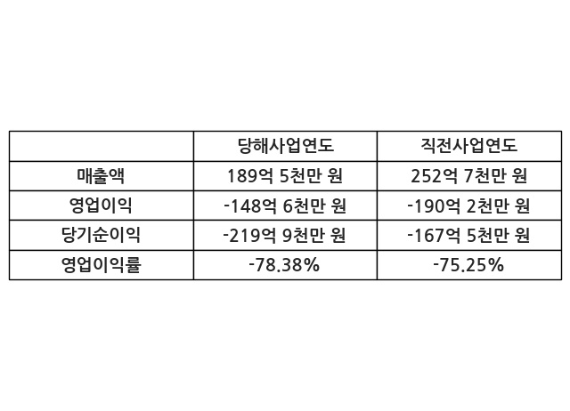 이번사업연도의 매출액은 직전사업연도 대비 -24.99% 감소한 189억 5천만 원, 영업이익은 -148억 6천만 원, 당기순이익은 -219억 9천만 원이라고 공시했다.