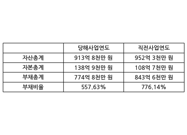 또한, 이번사업연도의 자산총계는 913억 8천만 원으로 직전사업연도 대비 -4.05% 감소한 한편, 부채총계는 774억 8천만 원으로 -8.15% 감소, 자본총계는 138억 9천만 원으로 27.83% 증가했다.