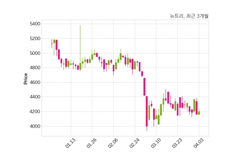 한편, 뉴트리는 장 마감 이후 해당 기업공시를 발표했으며 오늘 종가가 4,200원, 거래량은 7,314주로, 직전 거래일 대비 40원(+0.96%) 상승했다.