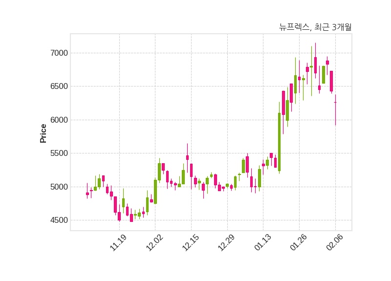 한편, 뉴프렉스의 15시 27분 현재주가는 6,260원으로 직전 거래일 대비 170원(-2.64%) 하락이며, 거래량은 415,686주이다.