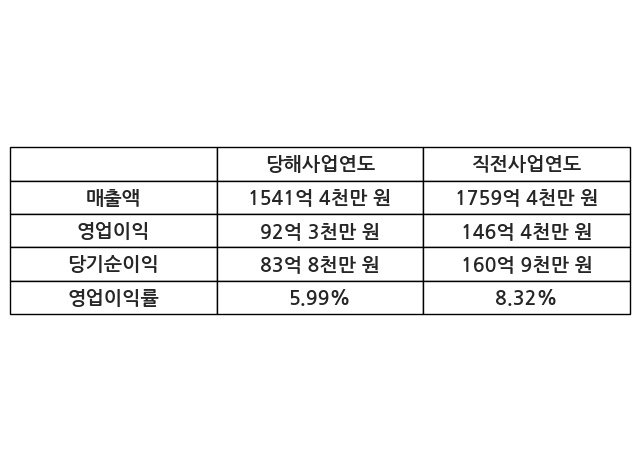 이번사업연도의 매출액은 직전사업연도 대비 -12.39% 감소한 1541억 4천만 원, 영업이익은 92억 3천만 원, 당기순이익은 83억 8천만 원이라고 공시했다.