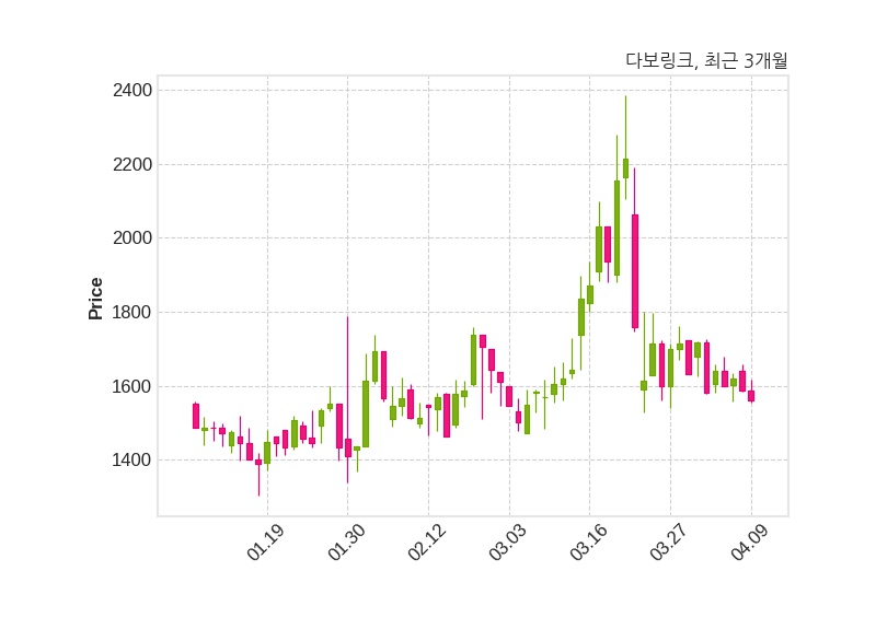 한편, 다보링크는 장 마감 이후 해당 기업공시를 발표했으며 오늘 종가가 1,560원, 거래량은 353,550주로, 직전 거래일 대비 28원(-1.76%) 하락했다.