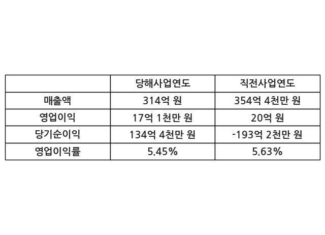 이번사업연도의 매출액은 직전사업연도 대비 -11.39% 감소한 314억 원, 영업이익은 17억 1천만 원, 당기순이익은 134억 4천만 원이라고 공시했다.
