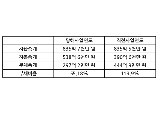 또한, 이번사업연도의 자산총계는 835억 7천만 원으로 직전사업연도 대비 0.03% 증가한 한편, 부채총계는 297억 2천만 원으로 -33.2% 감소, 자본총계는 538억 6천만 원으로 37.87% 증가했다.
