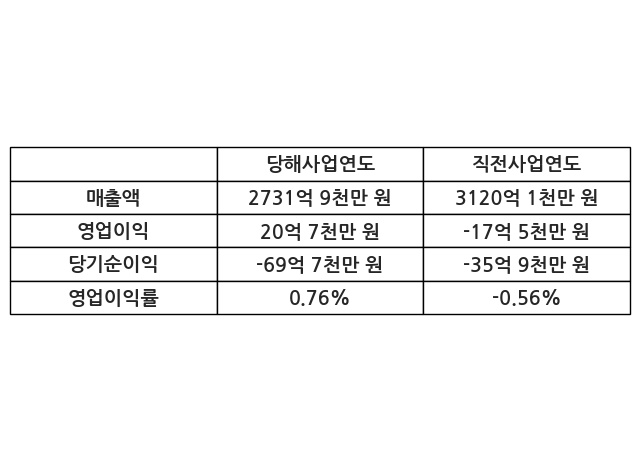 이번사업연도의 매출액은 직전사업연도 대비 -12.44% 감소한 2731억 9천만 원, 영업이익은 20억 7천만 원, 당기순이익은 -69억 7천만 원이라고 공시했다.