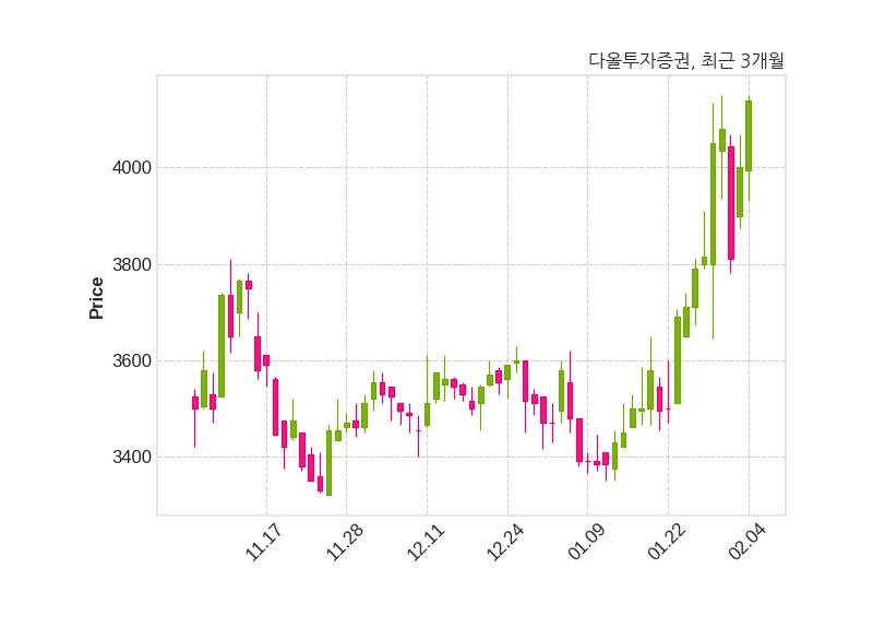 한편, 다올투자증권은 장 마감 이후 해당 기업공시를 발표했으며 오늘 종가가 4,140원, 거래량은 224,472주로, 직전 거래일 대비 140원(+3.5%) 상승했다.