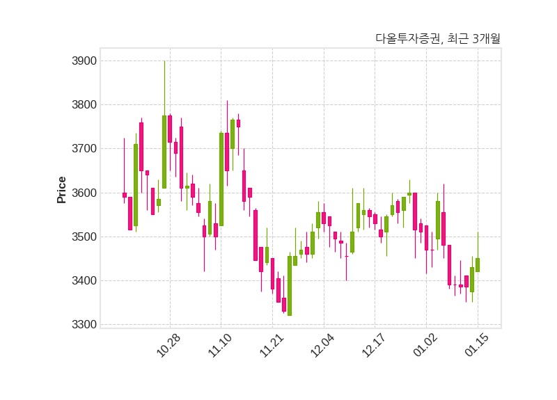 한편, 다올투자증권은 장 마감 이후 해당 기업공시를 발표했으며 오늘 종가가 3,450원, 거래량은 111,833주로, 직전 거래일 대비 20원(+0.58%) 상승했다.