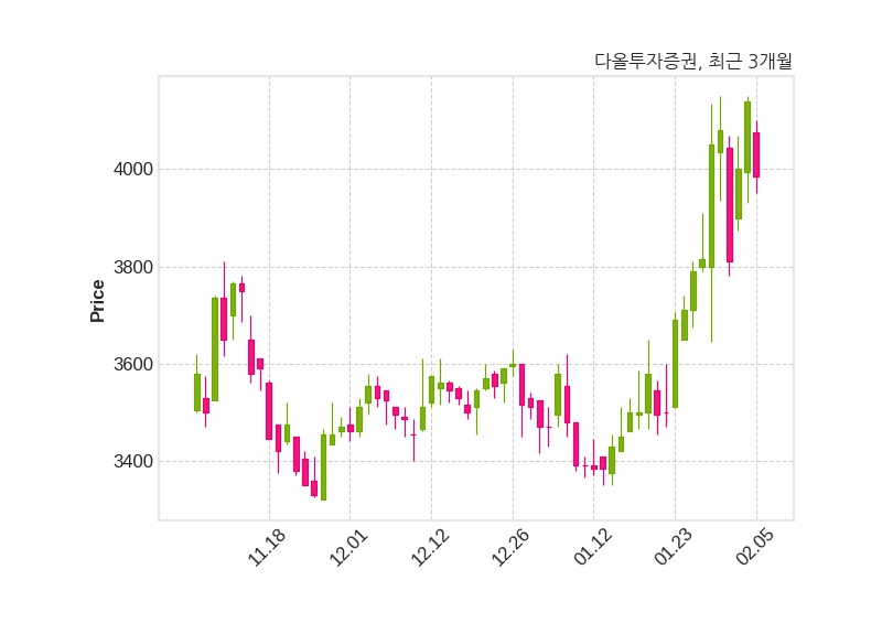 한편, 다올투자증권은 장 마감 이후 해당 기업공시를 발표했으며 오늘 종가가 3,985원, 거래량은 153,393주로, 직전 거래일 대비 155원(-3.74%) 하락했다.
