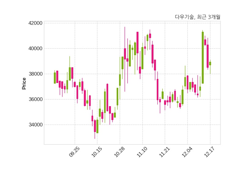 한편, 다우기술은 장 마감 이후 해당 기업공시를 발표했으며 오늘 종가가 38,950원, 거래량은 85,368주로, 직전 거래일 대비 450원(+1.17%) 상승했다.