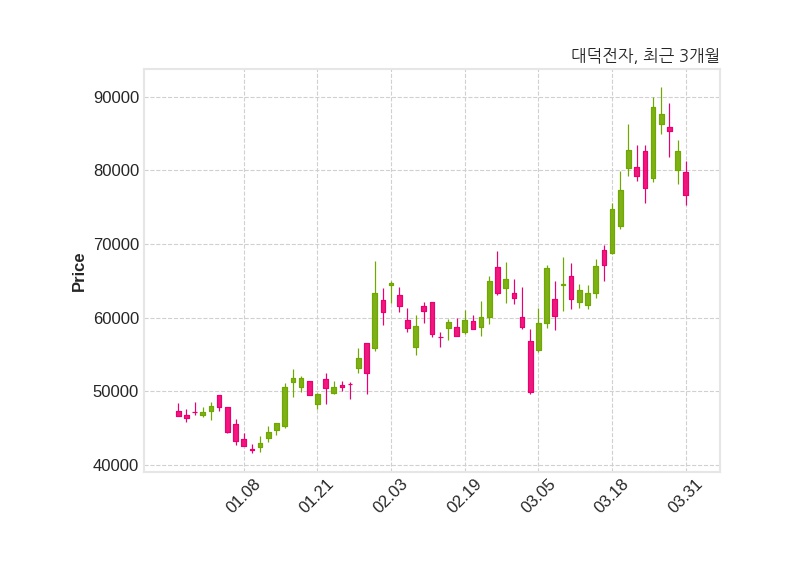한편, 대덕전자는 장 마감 이후 해당 기업공시를 발표했으며 오늘 종가가 76,700원, 거래량은 1,021,926주로, 직전 거래일 대비 6,000원(-7.26%) 하락했다.