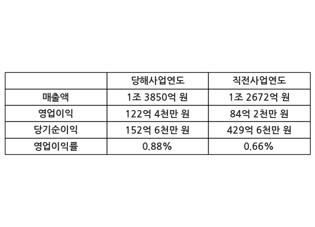 이번사업연도의 매출액은 직전사업연도 대비 9.3% 증가한 1조 3850억 원, 영업이익은 122억 4천만 원, 당기순이익은 152억 6천만 원이라고 공시했다.