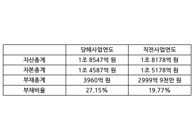 또한, 이번사업연도의 자산총계는 1조 8547억 원으로 직전사업연도 대비 2.03% 증가한 한편, 부채총계는 3960억 원으로 32.01% 증가, 자본총계는 1조 4587억 원으로 -3.89% 감소했다.