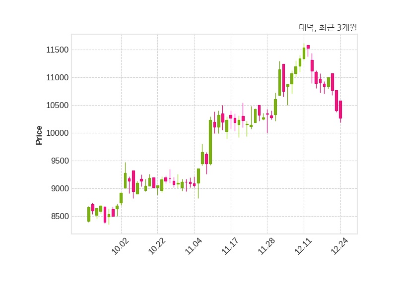 한편, 대덕은 장 마감 이후 해당 기업공시를 발표했으며 오늘 종가가 10,270원, 거래량은 169,386주로, 직전 거래일 대비 130원(-1.25%) 하락했다.
