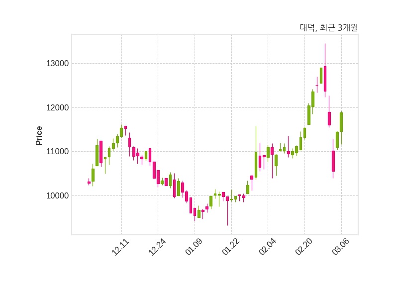 한편, 대덕은 장 마감 이후 해당 기업공시를 발표했으며 오늘 종가가 11,880원, 거래량은 117,658주로, 직전 거래일 대비 440원(+3.85%) 상승했다.