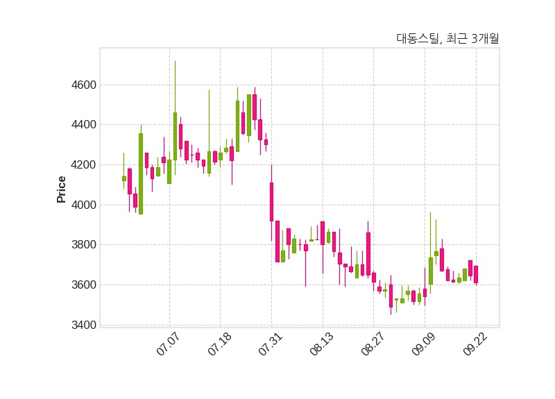 한편, 대동스틸은 장 마감 이후 해당 기업공시를 발표했으며 오늘 종가가 3,610원, 거래량은 28,728주로, 직전 거래일 대비 35원(-0.96%) 하락했다.