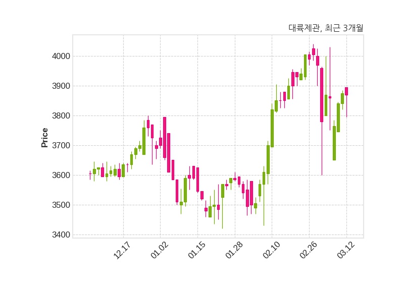 한편, 대륙제관은 장 마감 이후 해당 기업공시를 발표했으며 오늘 종가가 3,870원, 거래량은 4,552주로, 직전 거래일 대비 5원(-0.13%) 하락했다.