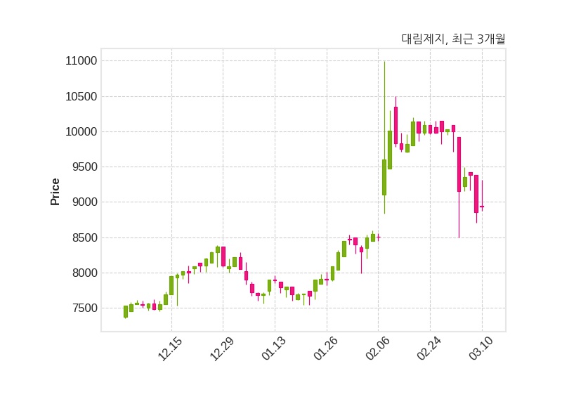 한편, 대림제지의 14시 43분 현재주가는 8,930원으로 직전 거래일 대비 80원(+0.9%) 상승이며, 거래량은 9,957주이다.