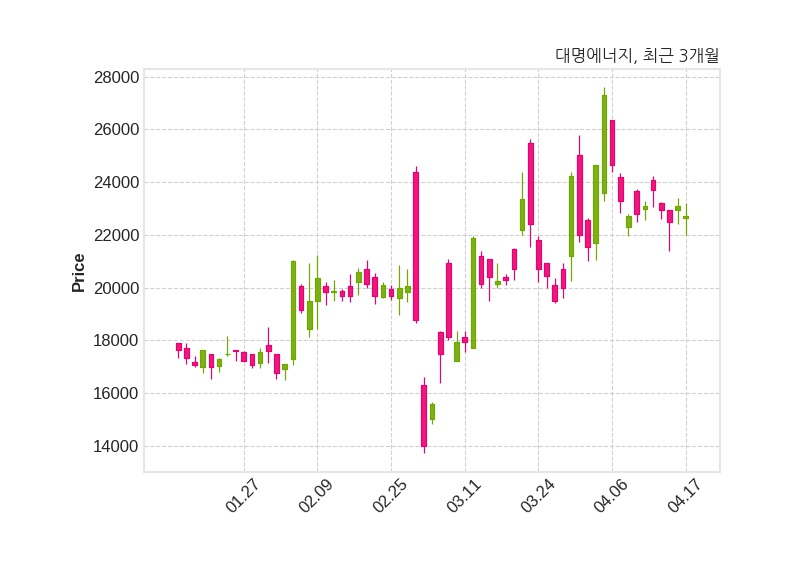 한편, 대명에너지의 11시 36분 현재주가는 22,700원으로 직전 거래일 대비 400원(-1.73%) 하락이며, 거래량은 111,877주이다.