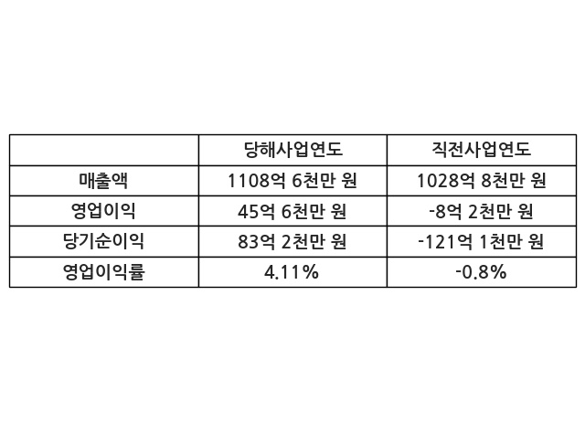 이번사업연도의 매출액은 직전사업연도 대비 7.76% 증가한 1108억 6천만 원, 영업이익은 45억 6천만 원, 당기순이익은 83억 2천만 원이라고 공시했다.