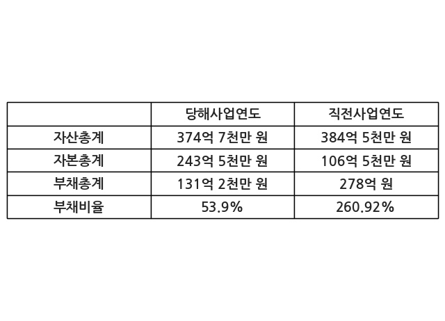 또한, 이번사업연도의 자산총계는 374억 7천만 원으로 직전사업연도 대비 -2.57% 감소한 한편, 부채총계는 131억 2천만 원으로 -52.8% 감소, 자본총계는 243억 5천만 원으로 128.5% 증가했다.