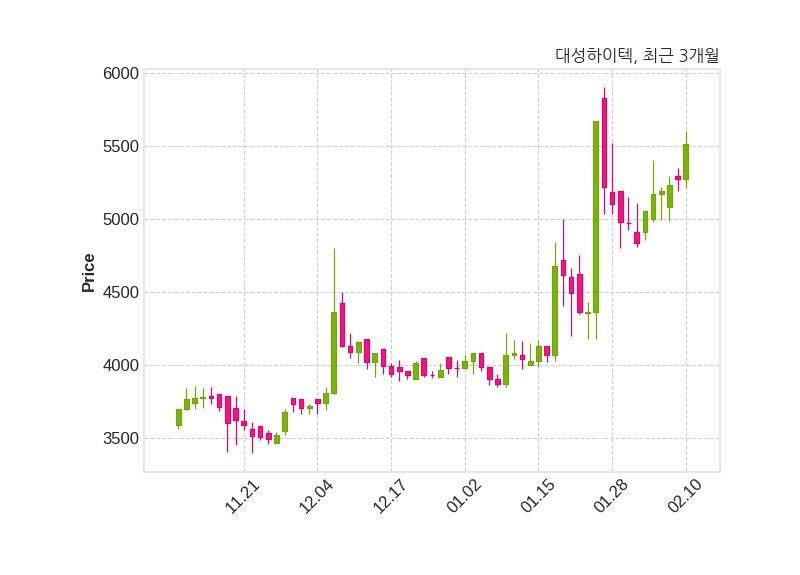 한편, 대성하이텍의 15시 04분 현재주가는 5,510원으로 직전 거래일 대비 240원(+4.55%) 상승이며, 거래량은 364,066주이다.