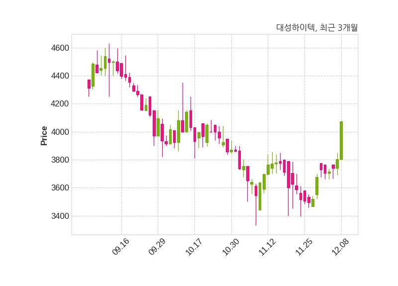 한편, 대성하이텍의 12시 26분 현재주가는 4,075원으로 직전 거래일 대비 270원(+7.1%) 상승이며, 거래량은 74,191주이다.