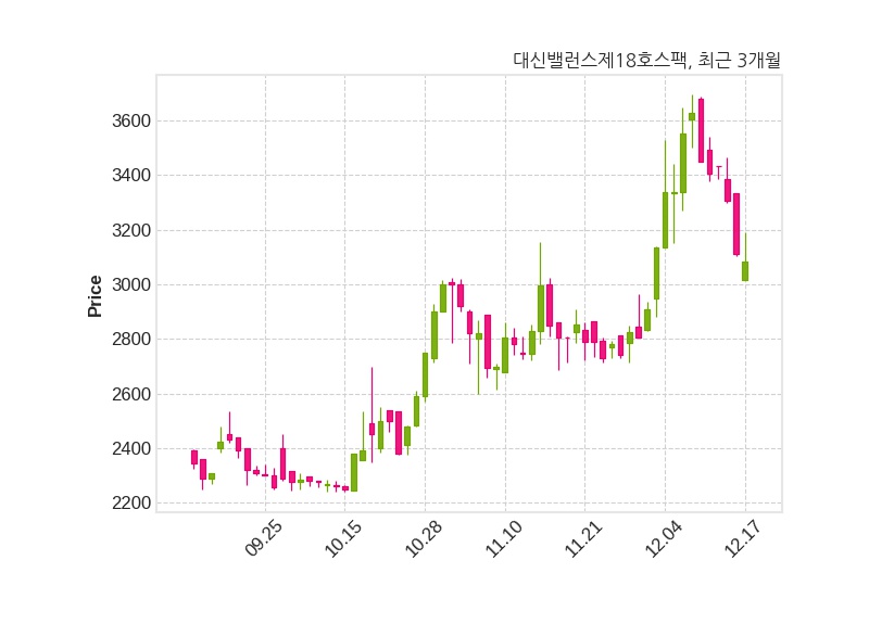 한편, 대신밸런스제18호스팩은 장 마감 이후 해당 기업공시를 발표했으며 오늘 종가가 3,085원, 거래량은 199,191주로, 직전 거래일 대비 25원(-0.8%) 하락했다.