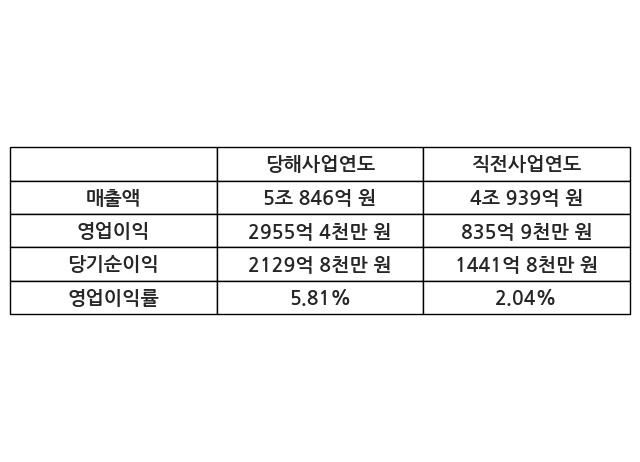 이번사업연도의 매출액은 직전사업연도 대비 24.2% 증가한 5조 846억 원, 영업이익은 2955억 4천만 원, 당기순이익은 2129억 8천만 원이라고 공시했다.