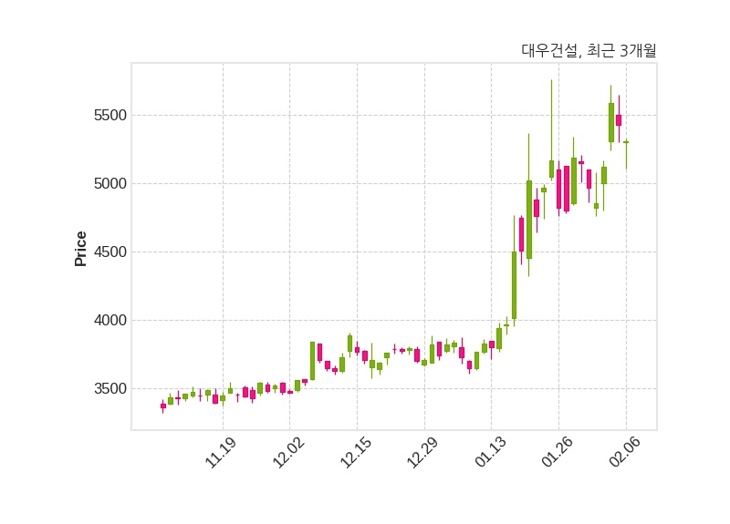 한편, 대우건설의 09시 48분 현재주가는 5,310원으로 직전 거래일 대비 120원(-2.21%) 하락이며, 거래량은 826,119주이다.