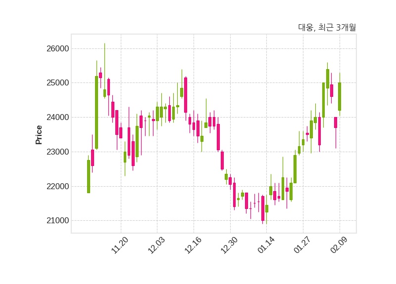 한편, 대웅의 14시 12분 현재주가는 25,000원으로 직전 거래일 대비 1,300원(+5.49%) 상승이며, 거래량은 132,253주이다.