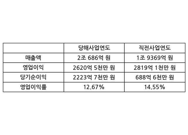이번사업연도의 매출액은 직전사업연도 대비 6.8% 증가한 2조 686억 원, 영업이익은 2620억 5천만 원, 당기순이익은 2223억 7천만 원이라고 공시했다.