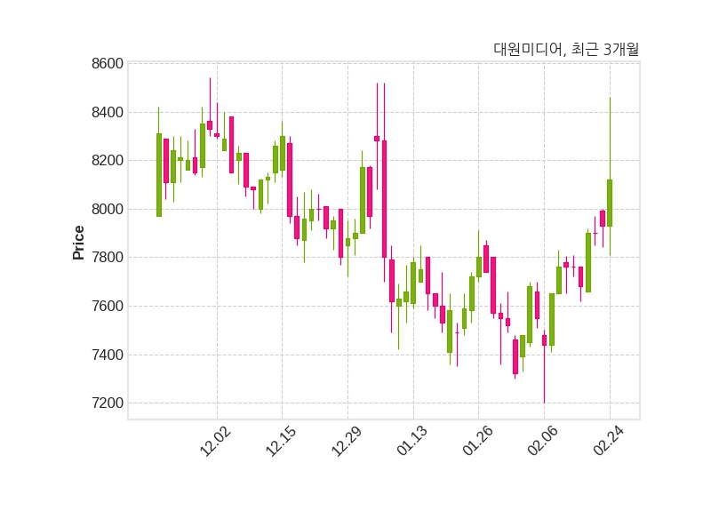 한편, 대원미디어의 14시 25분 현재주가는 8,120원으로 직전 거래일 대비 190원(+2.4%) 상승이며, 거래량은 101,296주이다.
