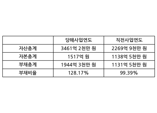 또한, 이번사업연도의 자산총계는 3461억 2천만 원으로 직전사업연도 대비 52.48% 증가한 한편, 부채총계는 1944억 3천만 원으로 71.83% 증가, 자본총계는 1517억 원으로 33.25% 증가했다.