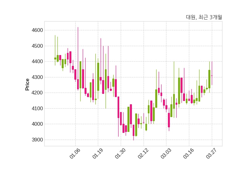 대원은 전응식, 김두식(각자 대표이사)에서 전응식, 조종호(각자 대표이사)으로 대표이사를 변경했다고 27일 공시했다. 변경 사유는 건설부분 대표이사 변경이다. 한편, 대원은 장 마감 이후 해당 기업공시를 발표했으며 오늘 종가가 4,310원, 거래량은 7,364주로, 직전 거래일 대비 35원(-0.81%) 하락했다.공시 전문으로 이동