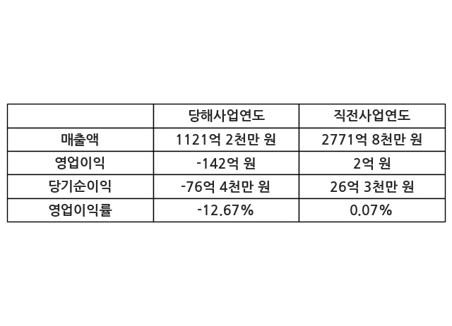 이번사업연도의 매출액은 직전사업연도 대비 -59.55% 감소한 1121억 2천만 원, 영업이익은 -142억 원, 당기순이익은 -76억 4천만 원이라고 공시했다.